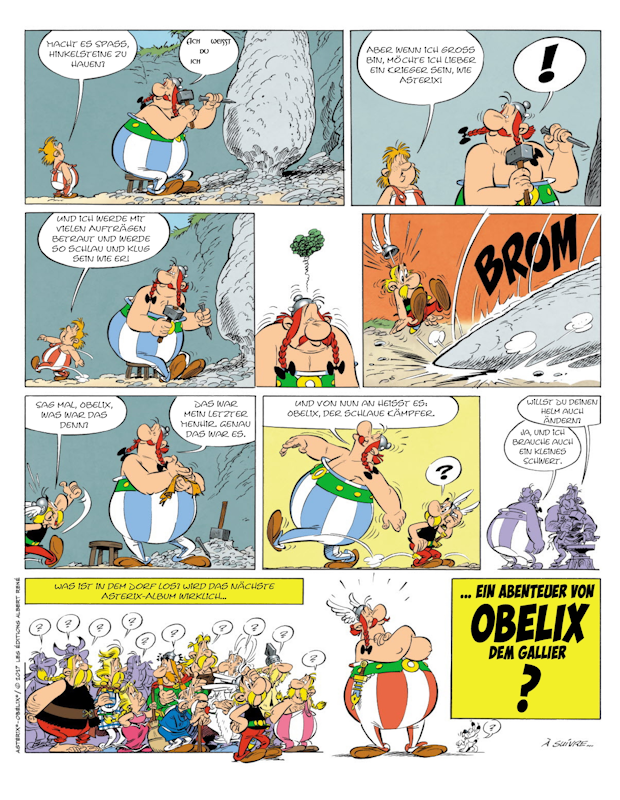 Vor dem Erscheinen des 37. Abenteuers im Oktober 2017 erhebt Obelix in einer einseitigen Sequenz den Anspruch, nicht immer nur der Nebendarsteller eines Albums zu sein. Selbstverständlich soll bei den Asterix-Fans damit die Spekulation über den Inhalt des kommenden Albums geweckt werden. Als "Obelix, der schlanke Kämpfer" bzw. "Ein Abenteuer von Obelix dem Gallier" wird eine umfassende Veränderung im Janar 2017 medienwirksam platziert (Abbildung).