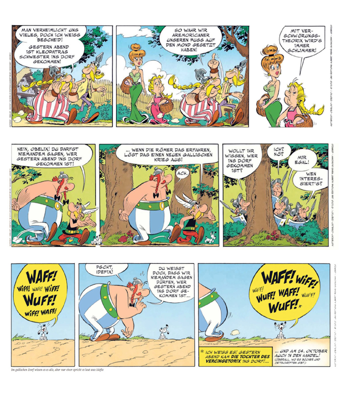 Im Vorwege des Albums mit der Tochter des Vercingetorix wird in einer zweiseitigen Ankündigung das Gerücht über den Besuch einer besonderen Persönlichkeit geschürt. Selbstverständlich können die Dorfbewohner mit dem Bewahren von Geheimnissen schlecht umgehen und so kommt sogar der Gallier Verschwörungstheorix zu seinem Kurzauftritt. Im letzten Bild der zweiten Seite ist es dann Idefix, der die Besucherin und damit den Titel des kommenden Abenteuers verrät (Abbildung Seite 1 und Abbildung Seite 2).