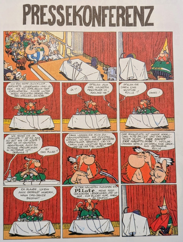 In Form einer Pressekonferenz unterrichtet Häuptling Majestix die Leser von Pilote Ausgabe Nummer 260 am 15. Oktober 1964 über die neue Asterix-Geschichte "Der Kampf der Häuptlinge". Diese Kurzgeschichte erschien mit deutschen Texten in Band 3 der neuen Gesamtausgabe (2000/2001), in Band IX der Sonderedition und mit einer textlich veränderten Version und einem Interview mit Uderzo in Comic Forum Nr. 46 von Oktober 1989.